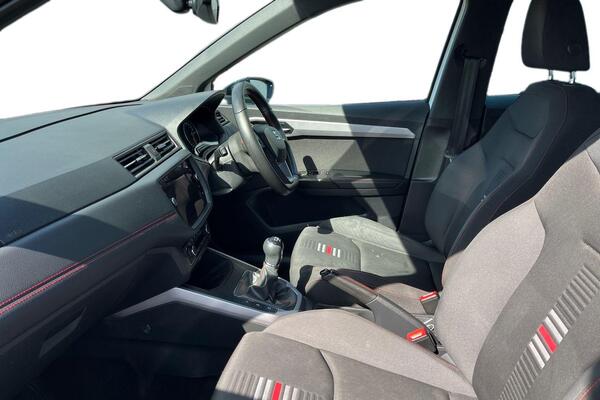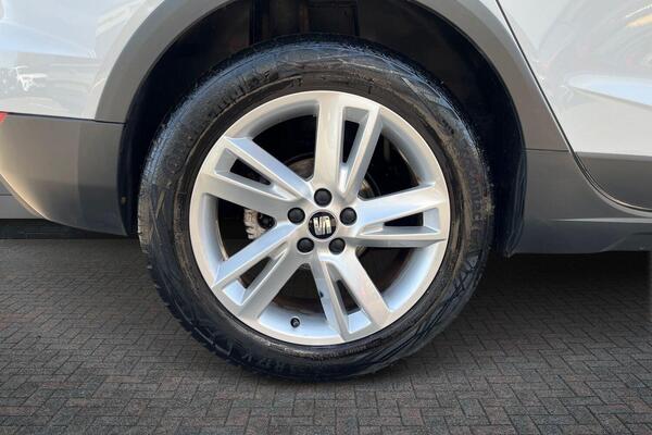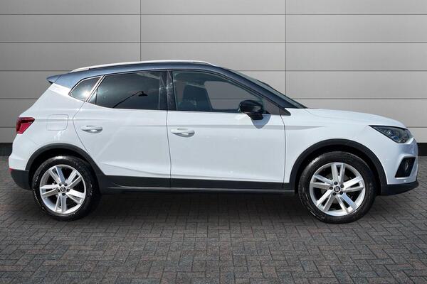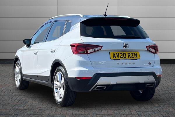 SEAT Arona 1.0 TSI FR 2020 en blanco Nevada con techo gris contrastante. Equipamiento FR deportivo: faros LED completos, llantas Dynamic de 17 pulgadas, volante de cuero plano perforado con costuras rojas, climatizador bizona y asientos delanteros sport. Apple CarPlay y Android Auto, SEAT Connect, detección de ángulo muerto y garantía SEAT Approved de 12 meses incluida. Historial de servicio completo.